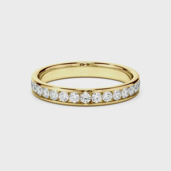 This stunning custom-made eternity wedding ring features a full band of round brilliant cut diamonds in an 18ct gold or platinum band. Exuding fluidity in its line work, and boasting an elegant silhouette, as with all the pieces in our Bespoke Collection, this piece is made especially for you.