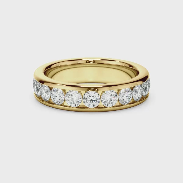 This stunning custom-made eternity wedding ring features a full band of round brilliant cut diamonds set on an 18ct gold or platinum band. Exuding fluidity in its line work, and boasting an elegant silhouette, as with all the pieces in our Bespoke Collection, this piece is made especially for you.