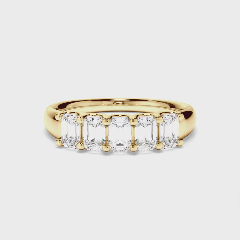 This stunning custom-made anniversary ring features five emerald cut diamonds set on an 18ct gold or platinum band. Exuding fluidity in its line work, and boasting an elegant silhouette, as with all the pieces in our Bespoke Collection, this piece is made especially for you.
