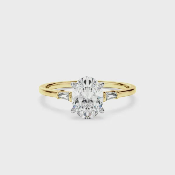 - Side stones: 2 x 0.08ct Tapered Baguette Cut E+ VS+ Laboratory-Grown Diamonds = 0.16ct TDW