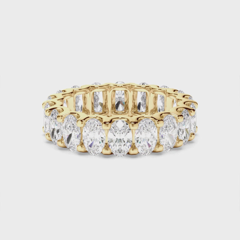 This stunning custom-made eternity ring features a full band of oval cut diamonds set on an 18ct gold or platinum band. Exuding fluidity in its line work, and boasting an elegant silhouette, as with all the pieces in our Bespoke Collection, this piece is made especially for you.