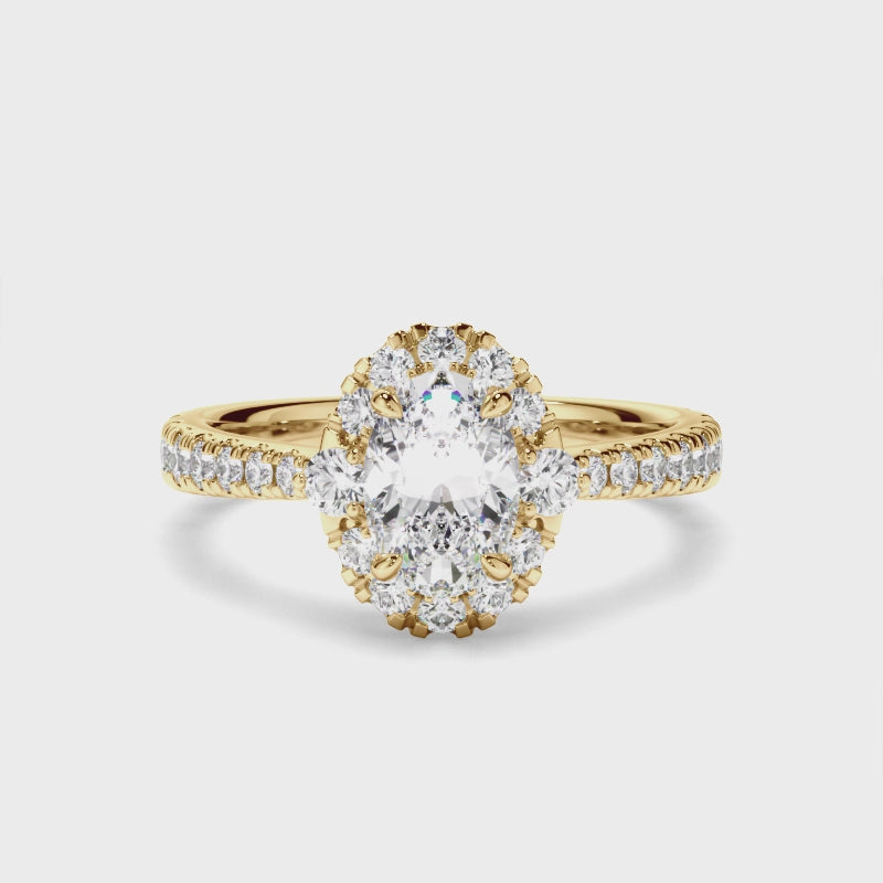 This timeless custom-made oval cut diamond engagement ring, made with your choice of diamond centre stone, features a diamond halo and a half band of pave diamonds. Exuding fluidity in its line work, and boasting an elegant silhouette, as with all the pieces in our Bespoke Collection, this piece is made especially for you.