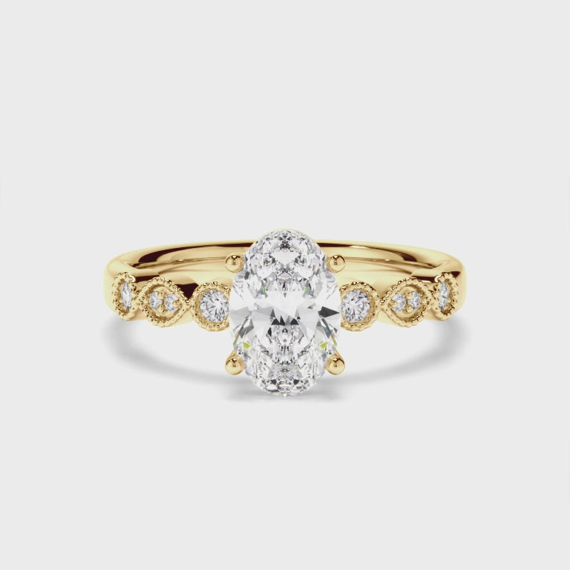 This timeless custom-made oval cut diamond engagement ring, made with your choice of diamond centre stone, features diamond accent stones and milgrain detailing. Exuding fluidity in its line work, and boasting an elegant silhouette, as with all the pieces in our Bespoke Collection, this piece is made especially for you.