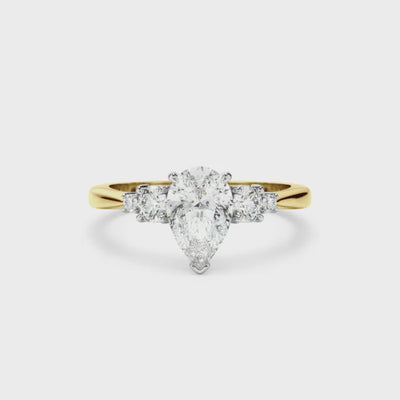 This timeless custom-made five stone diamond engagement ring, made with your choice of diamond centre stone, features a pear cut centre stone complimented by round brilliant cut side stones. Exuding fluidity in its line work, and boasting an elegant silhouette, as with all the pieces in our Bespoke Collection, this piece is made especially for you.