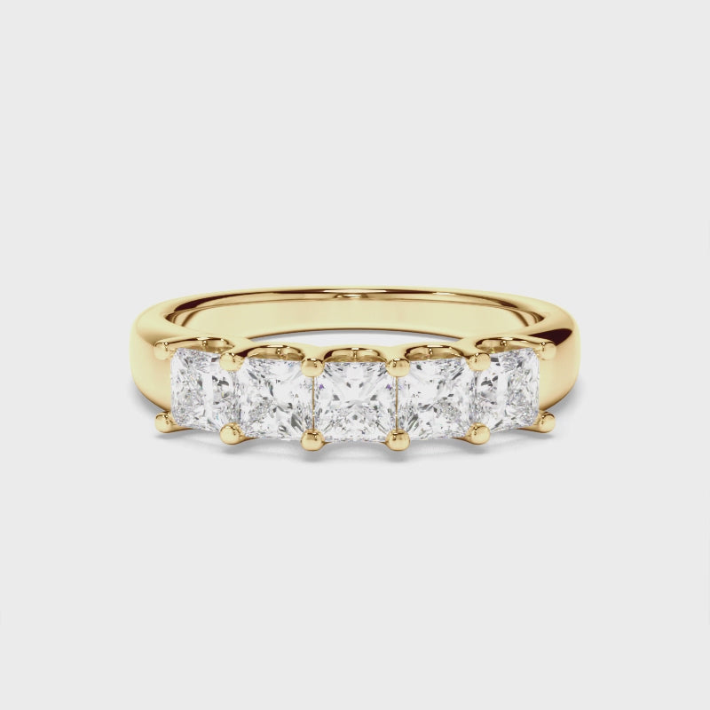 This stunning custom-made anniversary ring features five princess cut diamonds set on an 18ct gold or platinum band. Exuding fluidity in its line work, and boasting an elegant silhouette, as with all the pieces in our Bespoke Collection, this piece is made especially for you.
